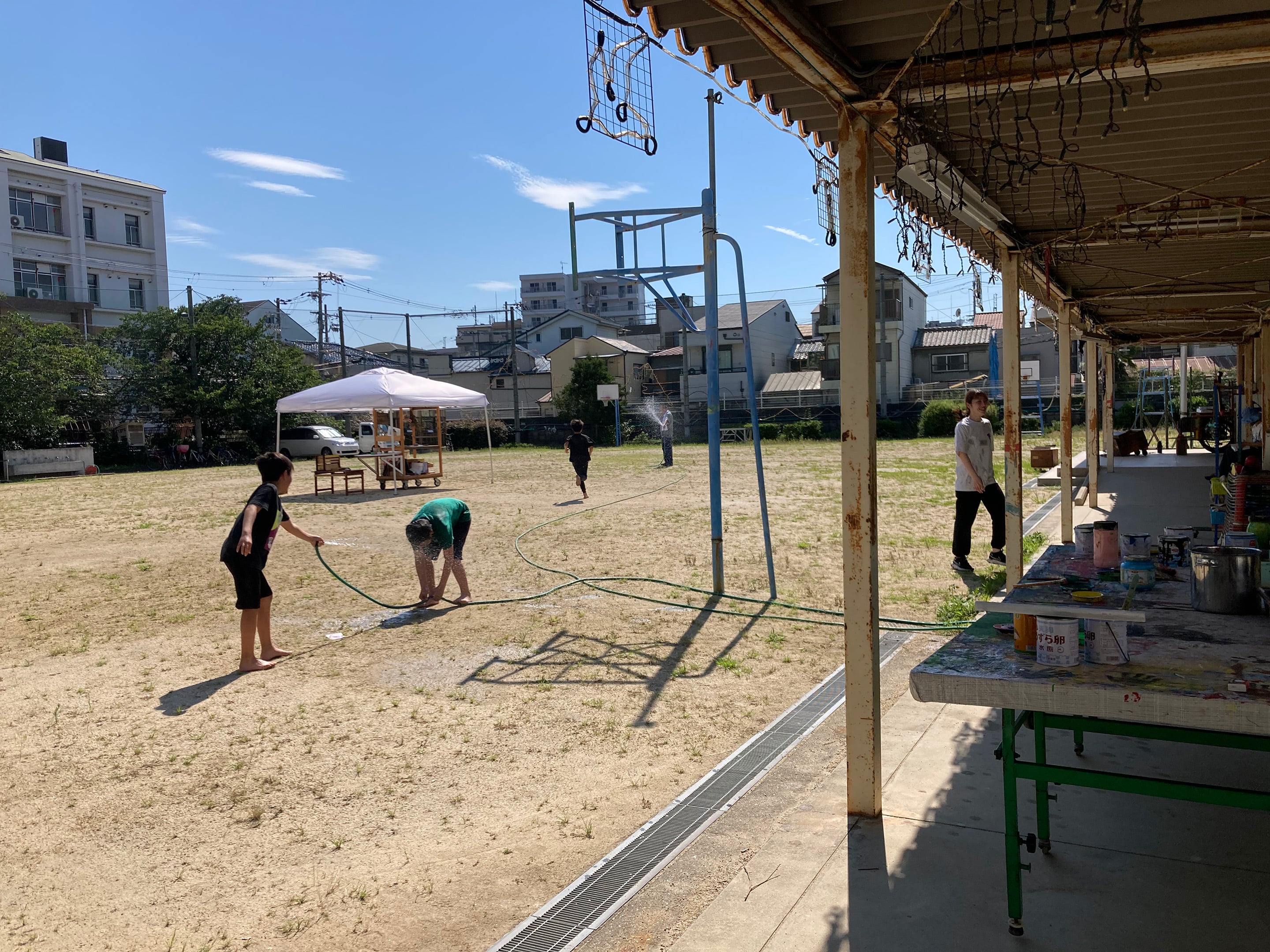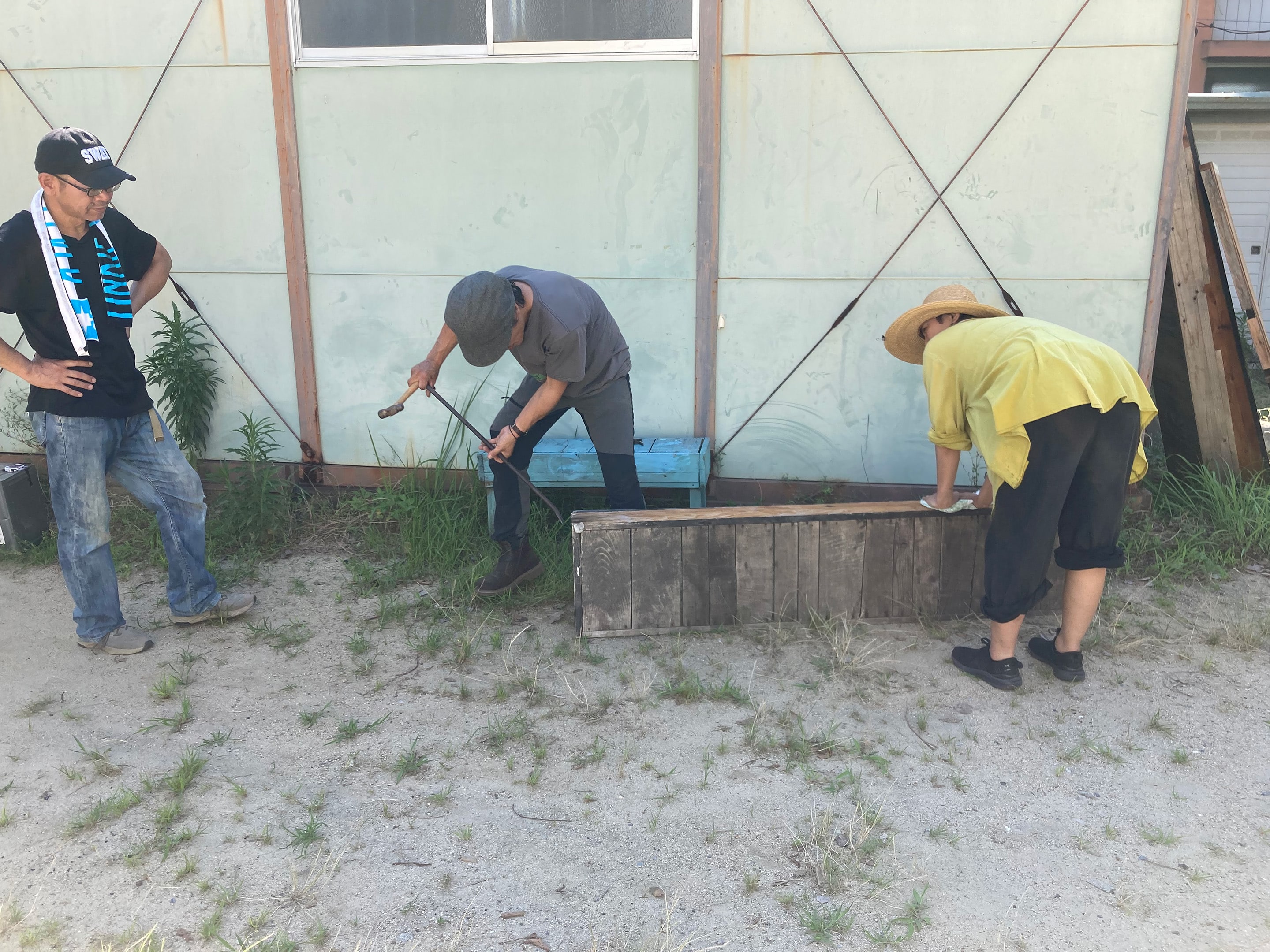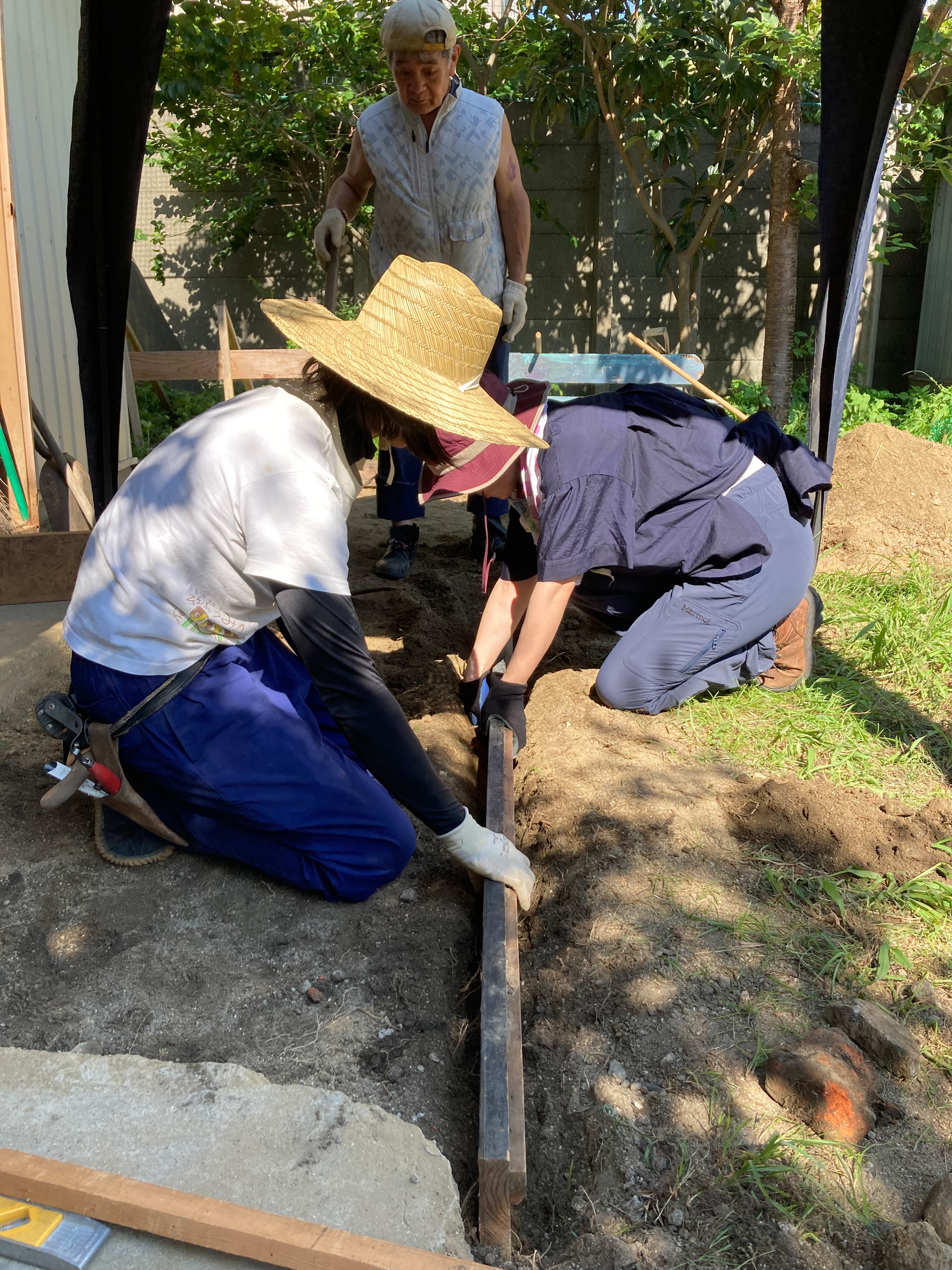 土曜日は、暑い中、数人で下地作り。草取り→すきとり等→廃材の良さげな板を型枠に。
